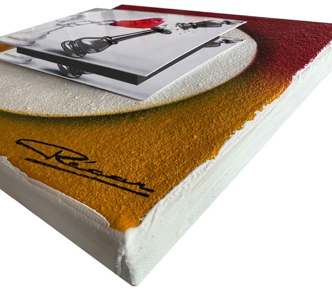 He paints exclusively with Amsterdam acrylic paint on canvas mounted on wooden stretcher bars